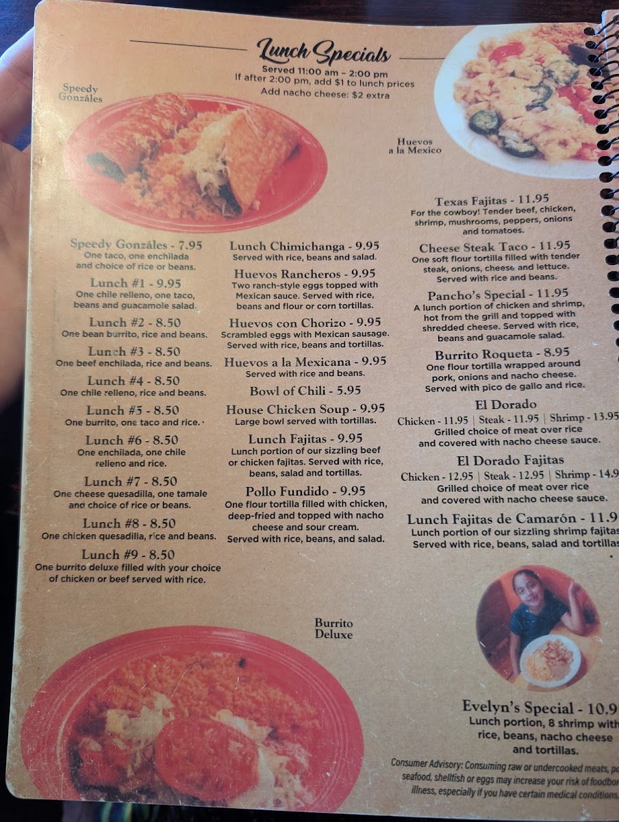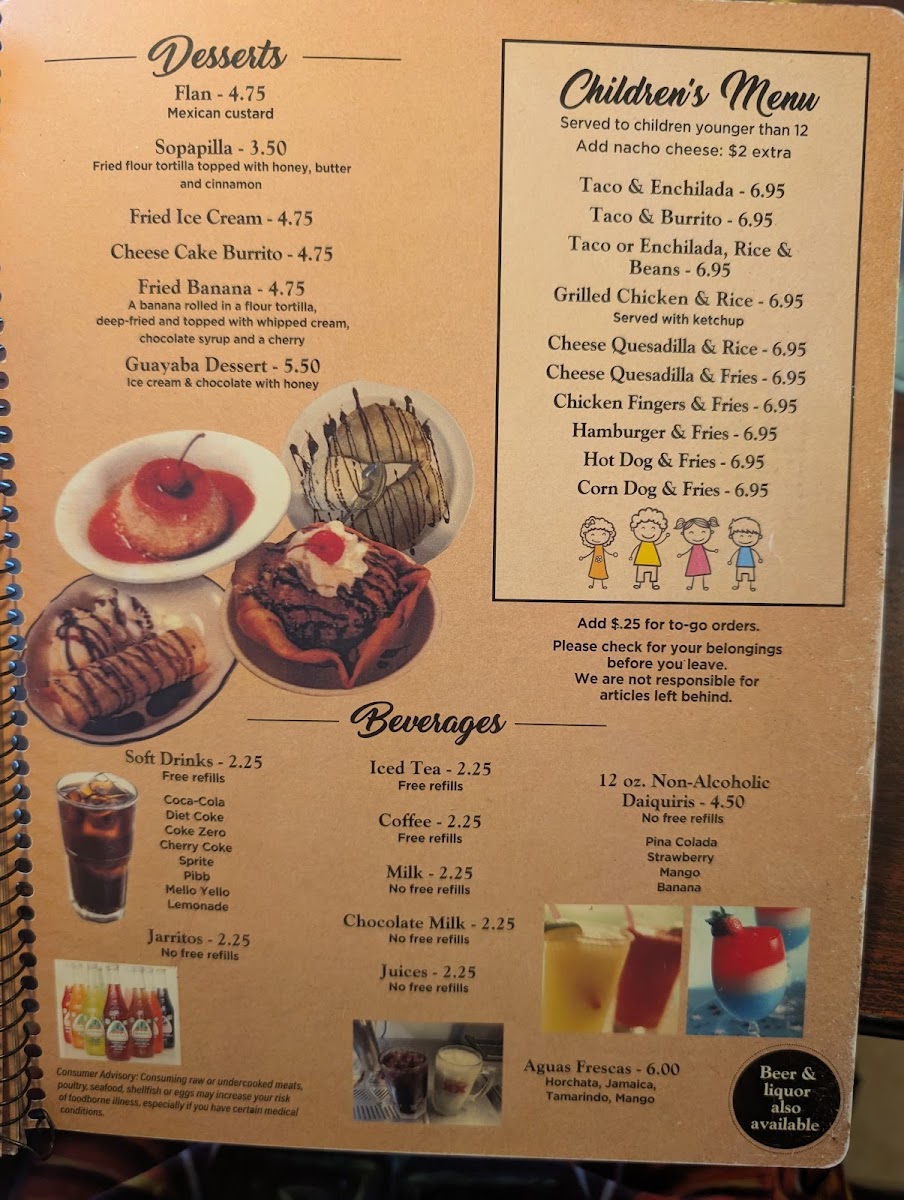 The variety includes satisfying favorites like carne asada tacos, chicken enchiladas rancheras, and hearty plates of rice and beans, alongside lighter options such as cheese quesadillas and fresh salsas. Meals here fit naturally into moments spent with friends and family, whether sharing a dinner combo or trying the Texas fajitas for two. The children’s menu ensures younger guests have tasty, familiar choices, while beverages like strawberry daiquiris and classic margaritas round out the experience with casual refreshment.
